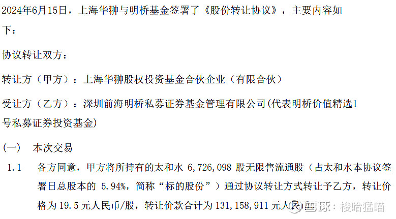 24年6月份华翀基金就发起过清仓式转让股份给深圳前海私募,转让价是19.5每股,大约1.3亿。25年1月份终止转让(由于客观情况发生变化)大概率是因为年报出炉,知道太和水要ST了,所以前海私募不打算冒风险。那次转让价格也代表着价格底线。