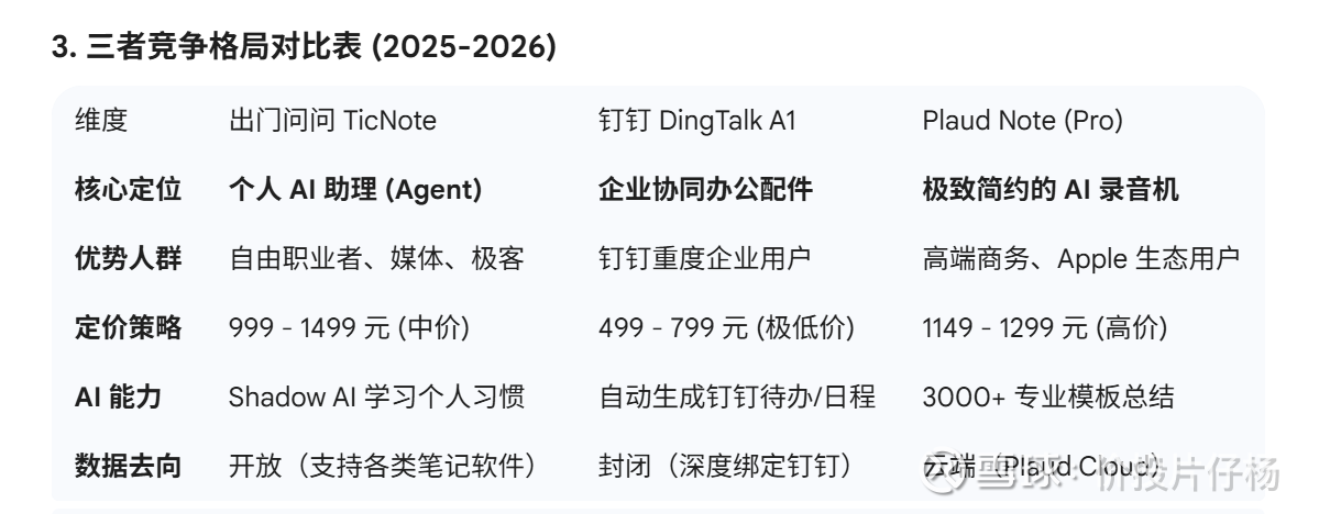 在 2026 年的 AI 硬件市场中,出门问问的 TicNote、钉钉的 DingTalk A1 以及 Plaud Note 构成了“AI 录音笔三剑客”。虽然它们形态相似(都是磁吸卡片式),但背后的竞争逻辑完全不同。