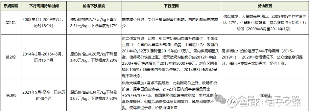 2008年以来,我国原奶主要经历了三轮显著周期:第1轮,历时18个月,原奶价格下跌17%;第2轮,历时15个月,原奶价格下跌20%;第3轮,21年9月至今,已经历时48个月,下跌幅度30%。每轮周期下行和反转的原因等见下表。本轮奶价下行幅度已突破前两轮原奶下行周期以及奶价的下跌幅度。