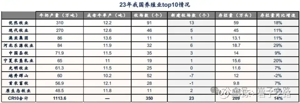 1、本轮上游扩产主要源自规模以上牧场。据荷斯坦,23年我国养殖业top10企业合计新建牧场23个、存栏量同比+14%(见下表)。农业部监测数据显示,23年奶牛养殖场户数虽然同比-24.2%,小型牧场数量减少,但大型牧场新建产能和设计存栏量仍有所提升,导致奶牛总存栏量还同比+6.7%。