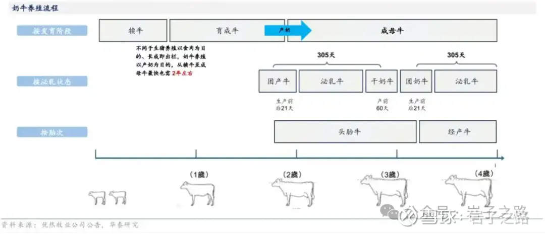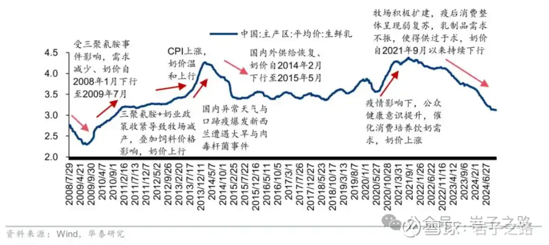 从生产角度看,奶牛从出生到产奶大约需要经过2年时间(生猪的生长周期一般只需6个月,所以猪周期会比原奶周期更加的敏感),因此上游供给端的调整往往滞后于需求的变化,且生鲜乳保质期较短,只能尽快通过直接消化或者喷粉等形式进行储存,也决定了原奶价格存在天然的周期性。