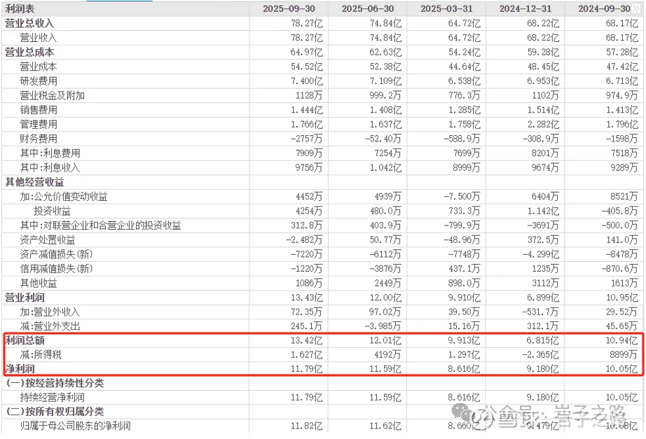 上面分析发现,25Q3营收增长14.81%,增速上与25Q2的16.07%相差很小,毛利率30.34%,还略高于25Q2的30%。但是25Q3扣非净利10.09亿元,只比25Q2的11.03亿0.06亿元。分析利润表会发现,主要还是所得税因素造成的。25Q3税前利润13.42亿元,比25Q2的12.01亿元多了1.41亿元,同比24Q3也是增长的22.7%,这样一看数据是不是更好一些。