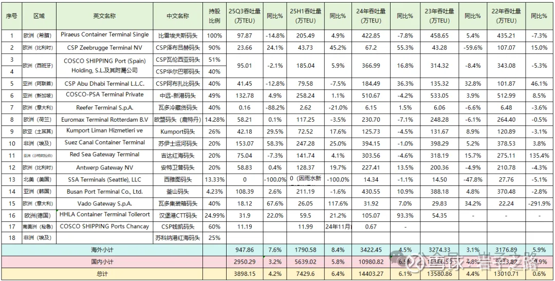 照例先看看各港口的吞吐量,23年收购的德国汉堡港(占比24.99%),25Q3吞吐量31.9万TEU,同比22%;24年11月通航的南美秘鲁的钱凯码头25Q3吞吐量11.19万TEU(而25Q2才是7.05万TEU,环比增长58.7%),显示出了中远海控母公司强大的带货能力和协同能力。(见下表1)