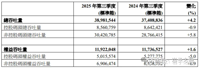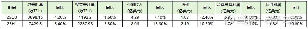 从总的吞吐量数据来看,25Q3权益吞吐量1192.2万TEU,同比1.6%;控股的码头营收4.29亿美元,同比增长7.4%;但因为毛利率下降,导致毛利25Q3毛利1.07亿美元,同比是-2.4%;合营联营码头利润依然稳健增长,25Q3为0.93亿美元,同比增长10.80%;最终公司25Q3归母利润0.83亿美元,同比0.80%。
