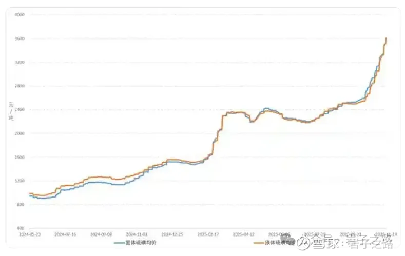 2024年以来,硫磺价格呈现明显的上涨趋势,在2025年11月达到高峰,成为市场备受关注的焦点。2025年11月14日,国内99.5%硫磺华东地区到岸价报3860元/吨,月环比上涨43%,同比上涨166%。外盘合约价格也持续走高,部分中东12月船货成交价已对应到岸成本超4000元/吨,对国内价格形成强支撑。这一波硫磺价格的大幅上涨,背后是供给端的持续收缩、低库存以及新能源需求爆发等多重因素的共同作用。