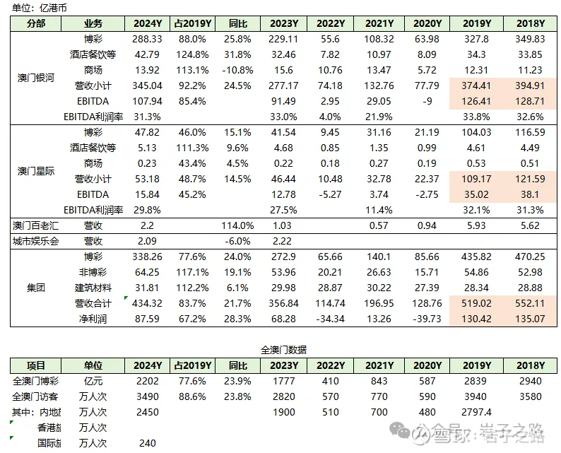 3、到2024年,澳门访客3490万人次,恢复至2019年的88.6%,博彩营收2202亿元,恢复至2019年的77.6%。并且非常巧合的是银河2024年博彩营收338.26亿港币,也刚好恢复至2019年的77.6%。