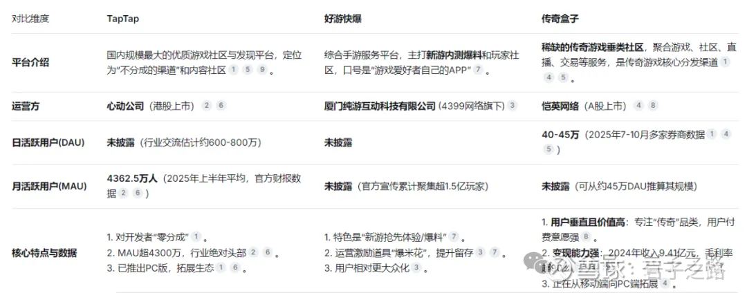 除了TapTap,国内主流的垂直游戏社区还包括好游快爆、传奇盒子等,同时哔哩哔哩、小红书等综合平台也构成了重要的游戏讨论阵地。TapTap与好游快爆、传奇盒子的简单对比(见下表,由DS整理,不确保准确)
