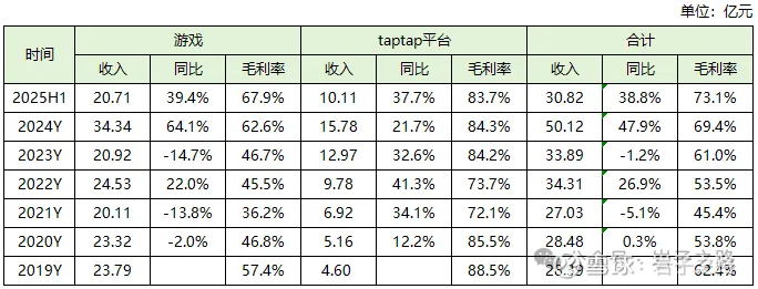 我们把业务拆开来看,找找增长的来源(见下表)。2020-2023年业绩游戏业务停滞不前,而TAP平台一直维持快速增长,营收从2019年的4.6亿元,增长到2024年的15.78亿元,5年GAGR为28%。而游戏业务从2024年开始快速增长,2024年营收同比64%,25H1同比39.4%,带动公司业绩在2024年和25H1爆发。
