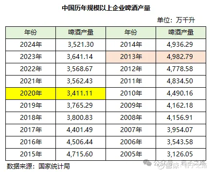 我国啤酒产量早在2013年已经达到巅峰,高达5062万千升。此后连续下滑,2018年跌破4000万千升大关。近年的最低点位2020年的3411.11万千升(因为疫情的原因),疫情过后产量开始缓慢回升,但2024年,我国啤酒产量同比又下降 0.6%。