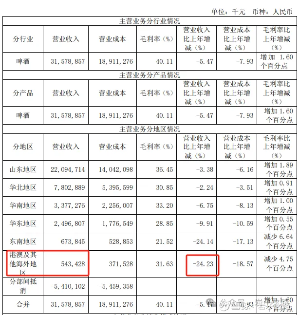 打开青岛啤酒2024年年报,公司说青岛啤酒在国际市场,公司以高品质、高价格、高可见度定位,持续推进海外市场产品分销覆盖和品 牌传播,目前已行销全球超 120 个国家和地区。报告期内,青岛啤酒在全球知名的品牌 评估机构 Brand Finance 年度 BSI 评选榜单中名列榜首,被评为 2024 年度世界最强啤酒品牌(The World's Strongest Beer Brand in 2024),全球品牌影响力持续提升。看起来很牛,但一看营收,都以为自己数错小数点。24年港澳台及海外地区营收5.43亿元,仅占公司总营收的1.72%,同比还下滑了-24.23%。看起来国际化的道路还任重道远。