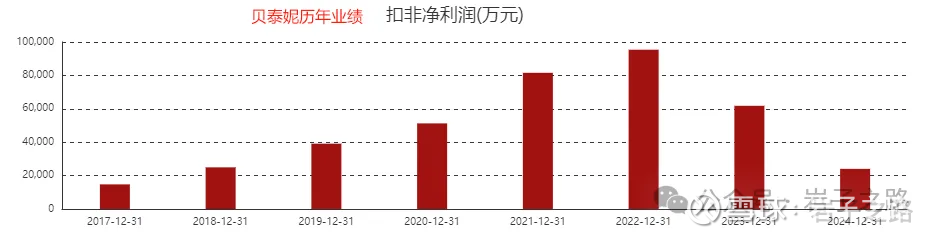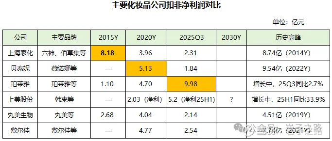 化妆品是个充分竞争的行业,从我分析的数据 来看,目前行业内的公司每隔几年都被洗牌一次,极考验公司管理层的经营智慧。我统计发现过去10年,每隔5年国内的龙头(以公司扣非净利为标准)都会更换一次(见下图)。2015年是上海家化,2020年是贝泰妮,2025年是珀莱雅,2030年是谁?这几年上美股份(韩束等)增速迅猛,如果增长能继续维持,珀莱雅的龙头地位可能很快会被挑战。并且从销售额看,上美股份25H1营收41.08亿元,和珀莱雅的53.62亿元,只有约30%的差距了。