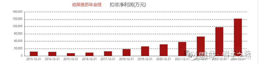 从行业公司来看,同花顺系统显示,化妆品行业上市公司共有14家,如下5家规模排前5。贝泰妮(主要品牌薇诺娜)、敷尔佳25Q3季报扣非净利润都是下滑40%+;上海家化自中国平安2011年控股上海家化以来,这家拥有百年历史的日化巨头便陷入管理层频繁更迭与组织架构剧烈震荡的漩涡,上海家化在短短十多年间经历了四任董事长,其业绩从2016年以来也是起伏不定(见如下图);只有珀莱雅和丸美生物的25Q3业绩还算稳定,珀莱雅25Q3季报净利润同比2.7%,丸美同比-5.4%。如果从历年经营业绩来看(见下图),只有珀莱雅一直处于上升阶段。港股上美股份(主要品牌韩束)目前市值最高,25H1净利同比增长33.9%
