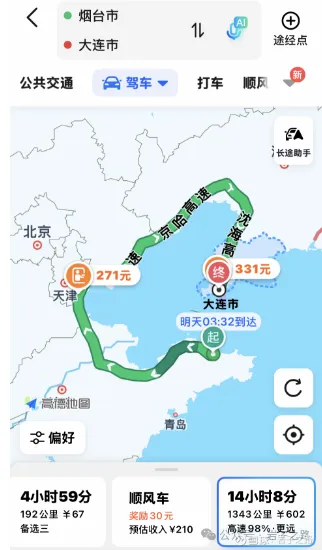 从上面这个可以看出,由于独特的地理位置优势,如果从烟台到大连,无论是从通行效率还是成本两方面考虑,坐船都是最佳选择。