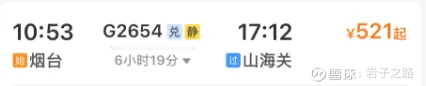 如果是选择高铁,目前无直达,只有中转方案。最快高铁组合:烟台 → 山海关(G2654,约 6.5 小时,二等座520元左右)→ 大连北(G1253,约 3 小时,二等座220元左右),全程票价约740元,时长约为11小时左右(取决中转时长)
