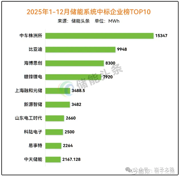 储能头条根据储能系统中标公开信息统计:2025年1-12月储能系统招中标126.29GW/428.995GWh;2025年1-12月份,中车株洲所中标15347MWh、 位列榜首;比亚迪中标9948MWh,列第二; 海博思创中标8300MWh,列第三;赣锋锂电中标7920MWh列第四; 紧接着是上海融和元储中标3488.5MWh、新源智储中标3482MWh、山东电工时代中标2660MWh、科陆电子2500MWh、易事特中标2264MWh、中天储能2167.128MWh分别位列2025年1-12月储能系统中标榜前十。(注:此数据统计中不包括集采未分配份额)
