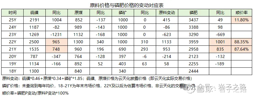 从历史数据看,硫磺价格在21年和22年价格上涨幅度也非常大,煤炭和磷矿也是涨价迅猛,但当年的磷肥价格也是迅速上涨,差不多实现了88%的顺价。而25年硫磺涨价到只实现了11.8%的顺价,显著低于个人预期。