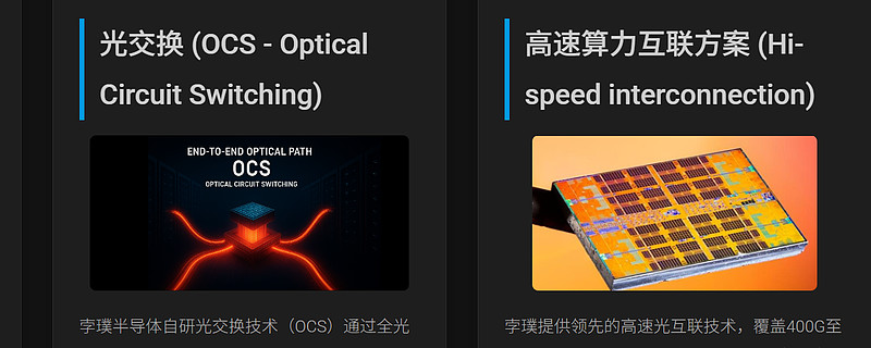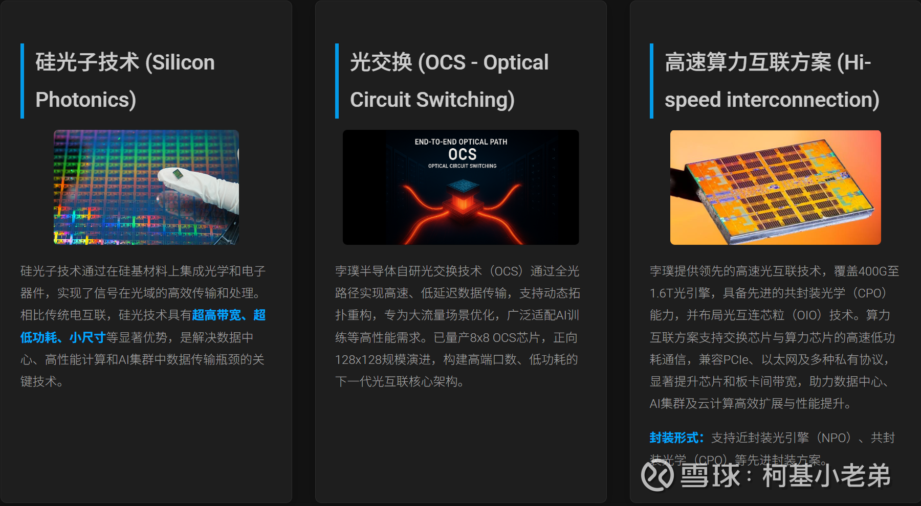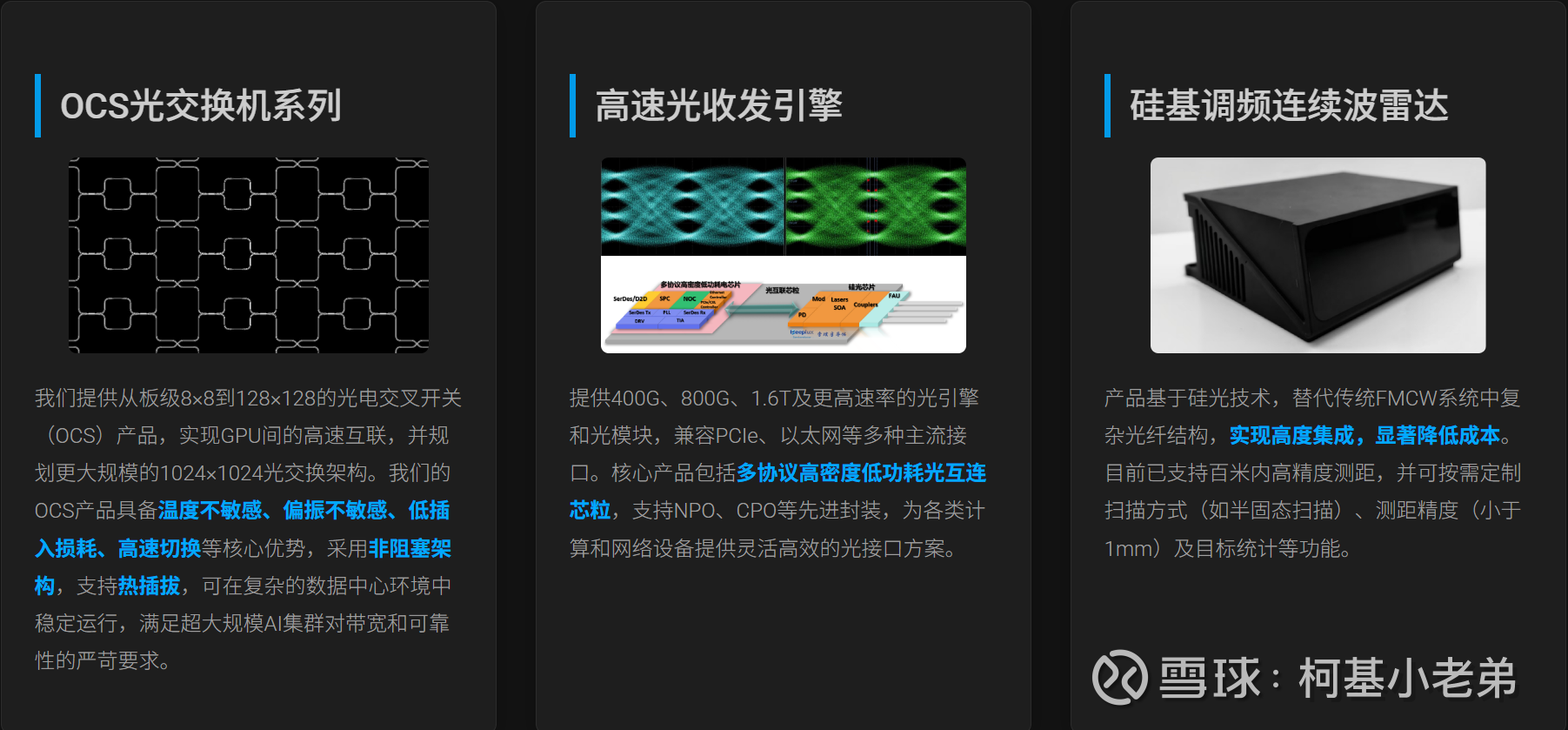 • 直击市场痛点的产品:量产8×8/128×128 OCS光交换机,支持GPU高速互联与1024×1024架构规划,低温敏、低损耗特性适配超大规模AI集群;400G - 1.6T高速光引擎兼容主流接口,支持CPO/NPO先进封装,解决传统互联瓶颈 。