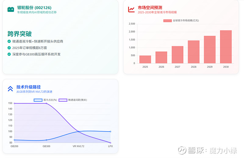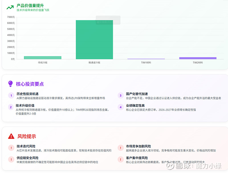 。从产业链价值分布来看,微通道冷板和液态金属材料的创新带来了显著的价值量提升。传统冷板的价值量约为 500 元 / 个,而微通道冷板由于制造工艺复杂、材料成本高,价值量提升至 5000-8000 元 / 个,增长了 10 倍以上