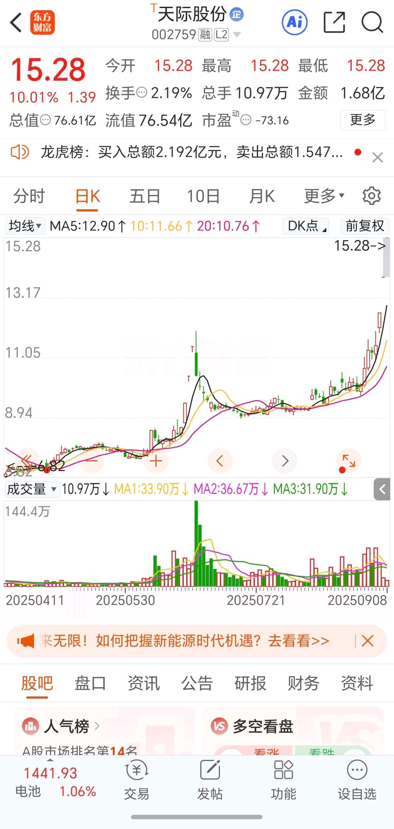 天际股份:3板,一字板,炒作固态电池(硫化锂)+六氟磷酸锂+磷化工。