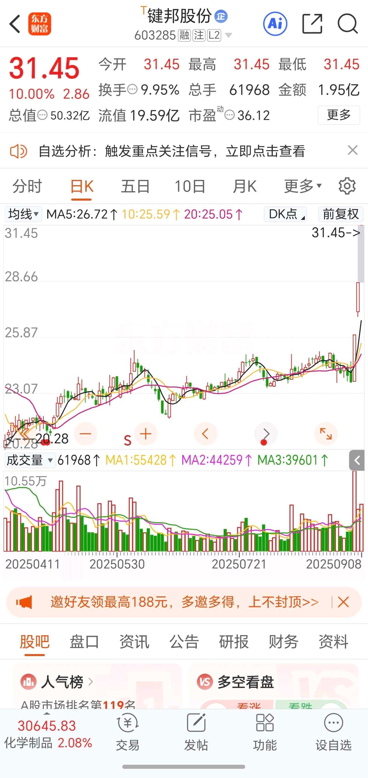 键邦股份:3板,一字板,炒作锂电池+功能助剂。