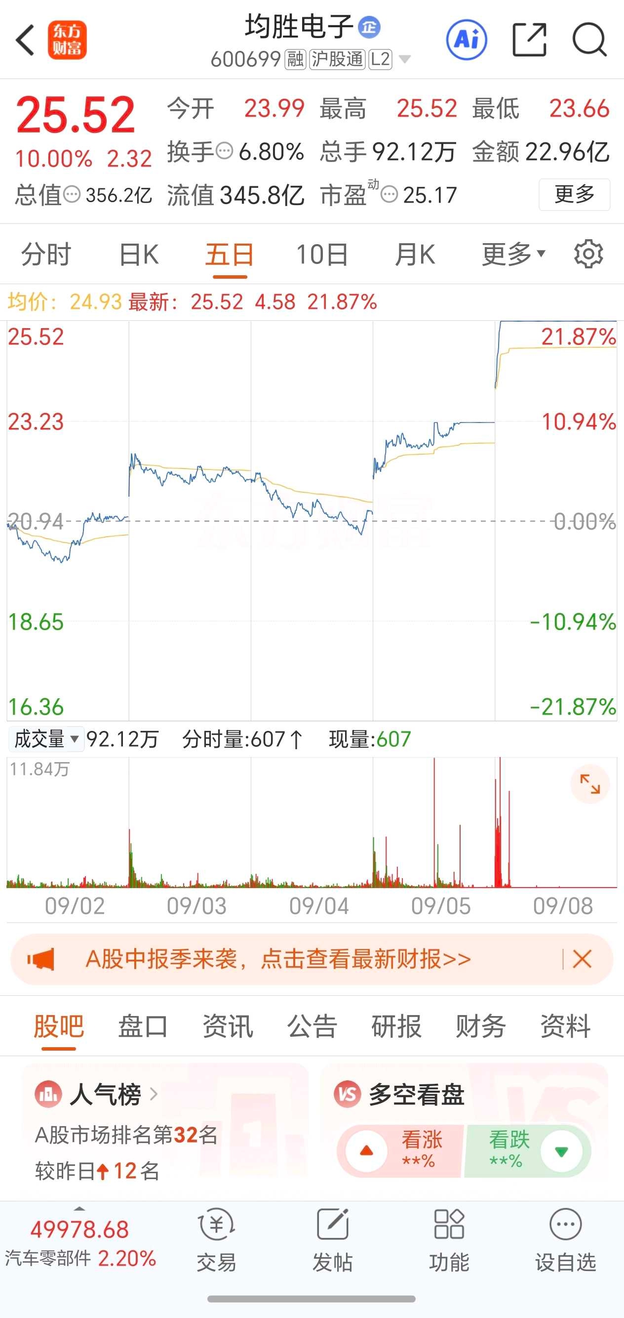 均胜电子:2板,换手板,炒作人形机器人+汽车电子+智能驾驶。