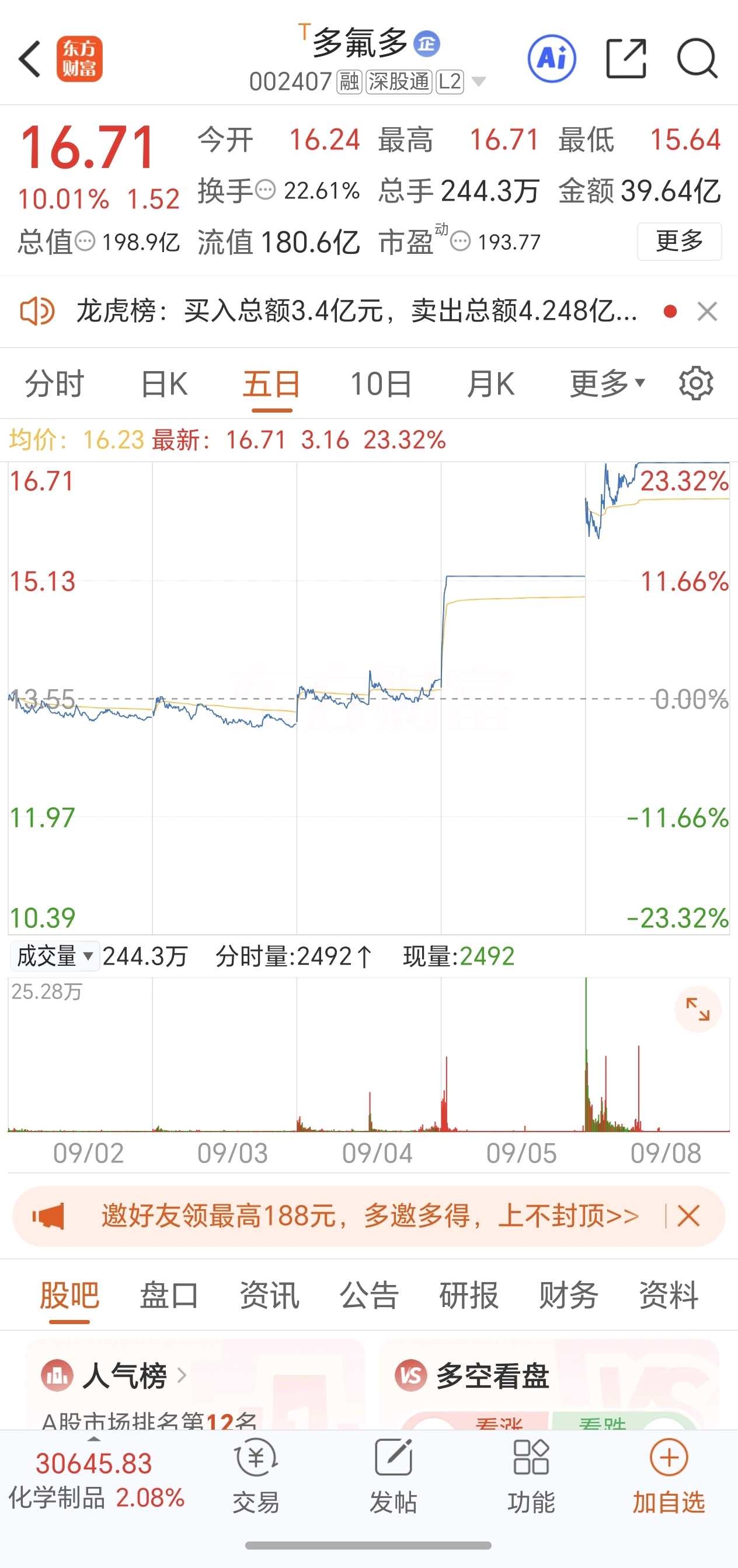 多氟多:2板,换手弱板,炒作固态电池+六氟磷酸锂+氟化工+纳电池。