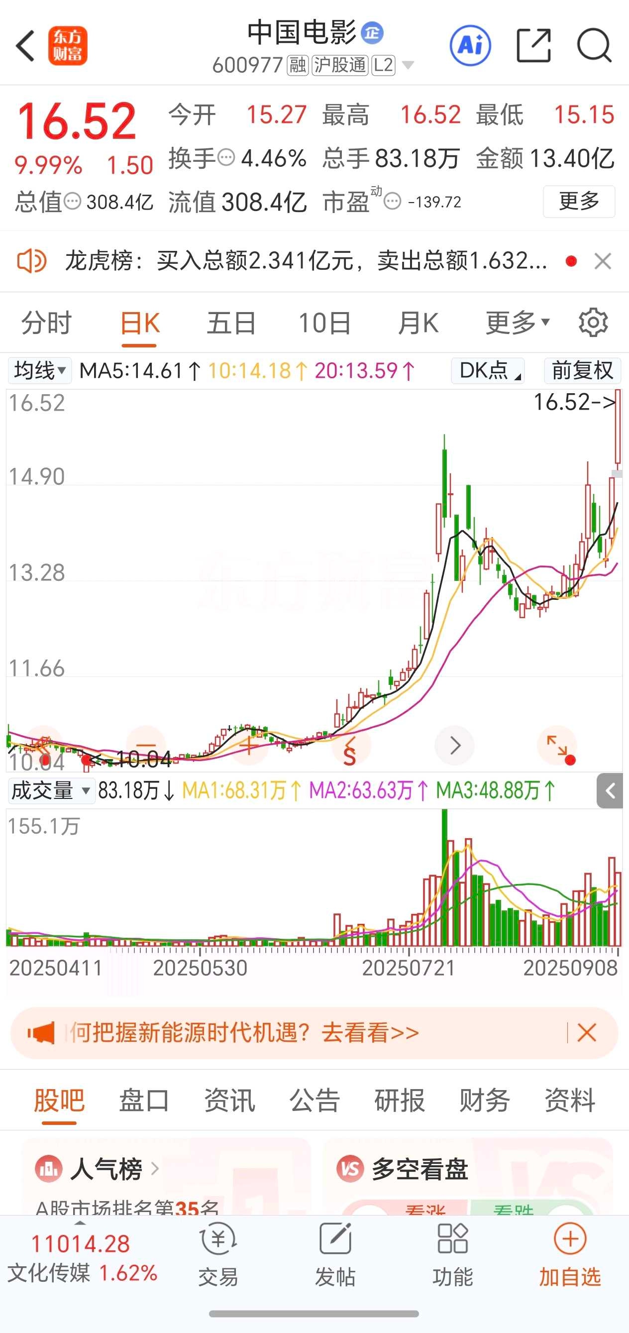 中国电影:2板,换手板,炒作《刺杀小说家2》+科幻电影+人工智能。