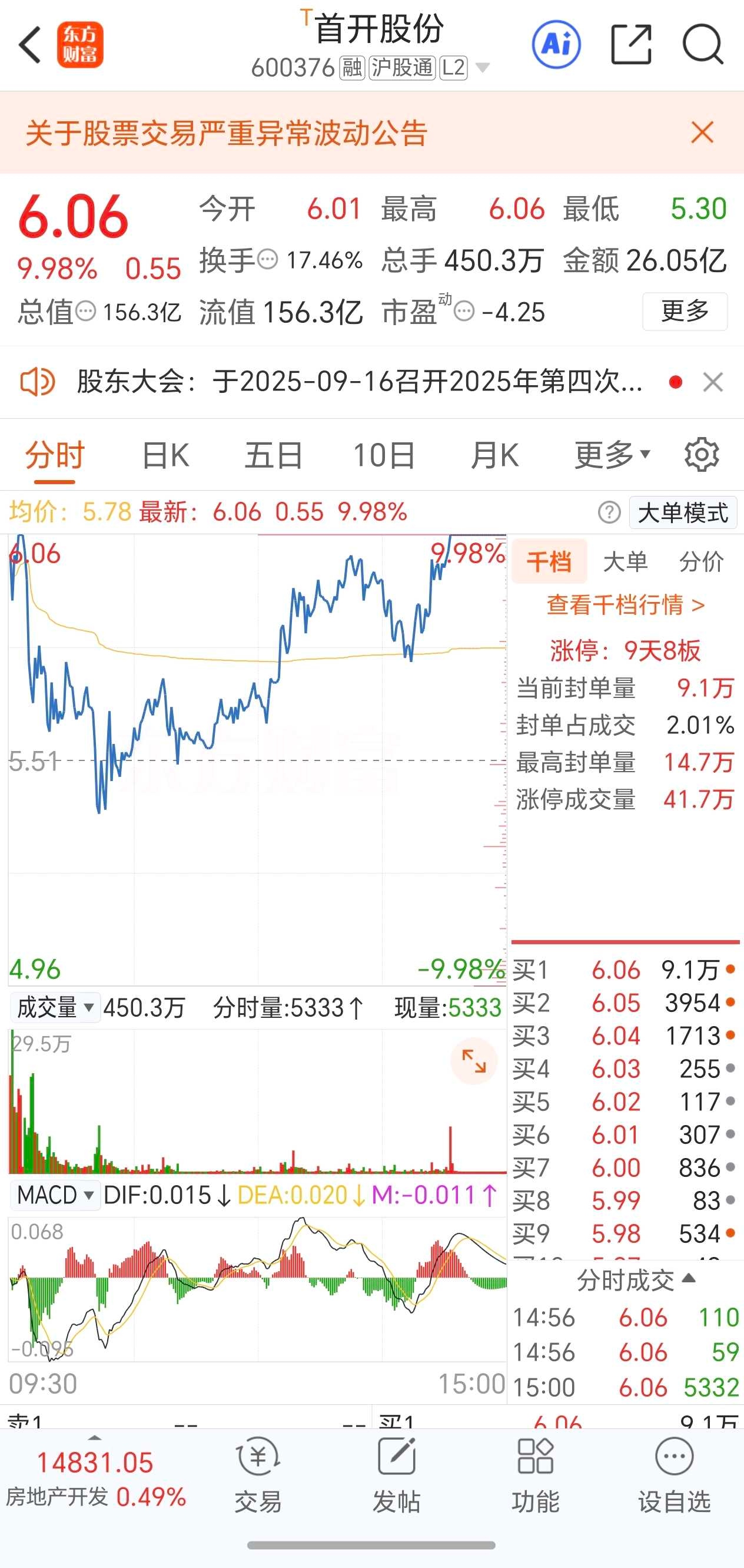 首开股份:尾盘回封涨停,2连板,9天8板,炒作间接投资宇树机器人+低价股+房地产开发。