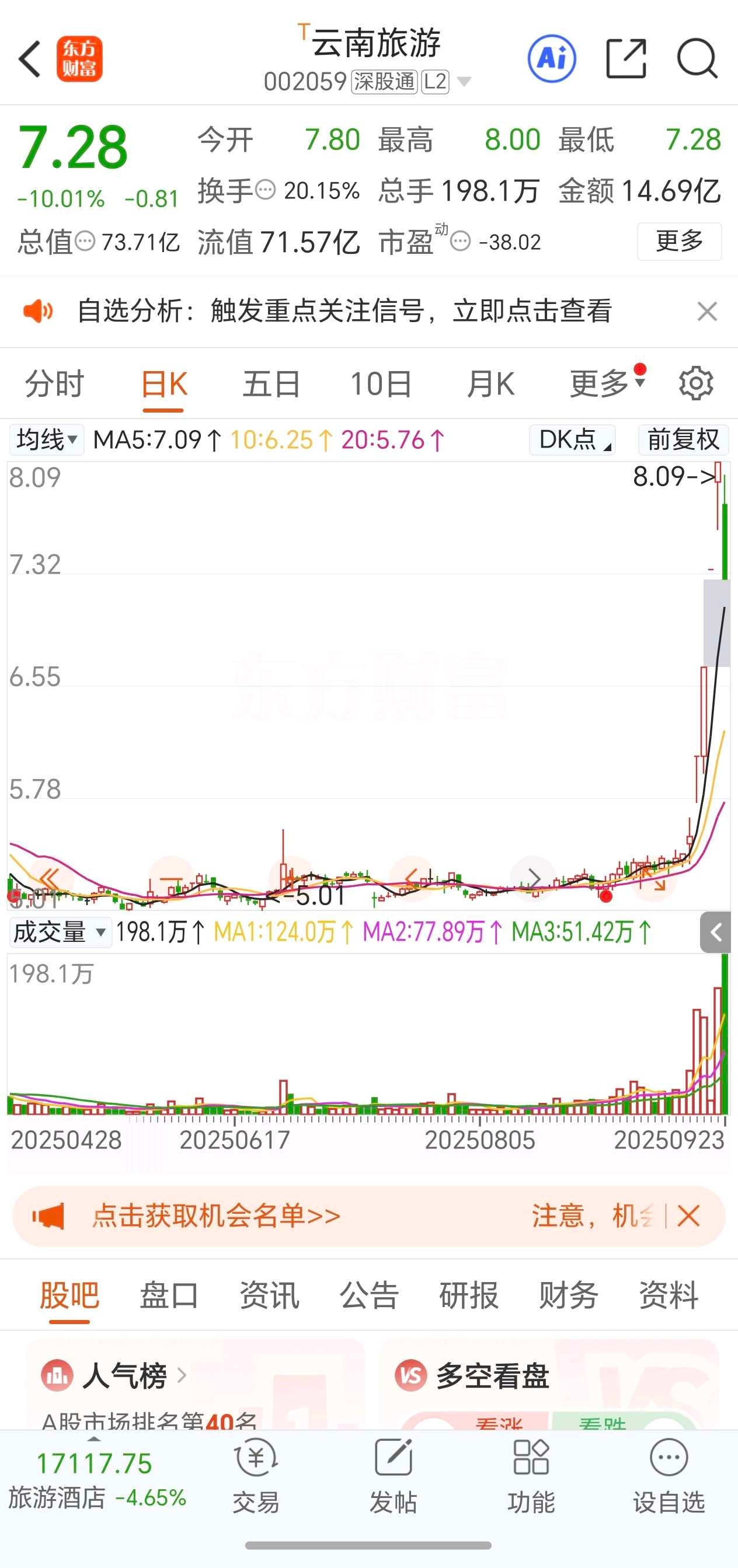 云南旅游:4进5,开盘被核,炒作低价股+旅游服务。