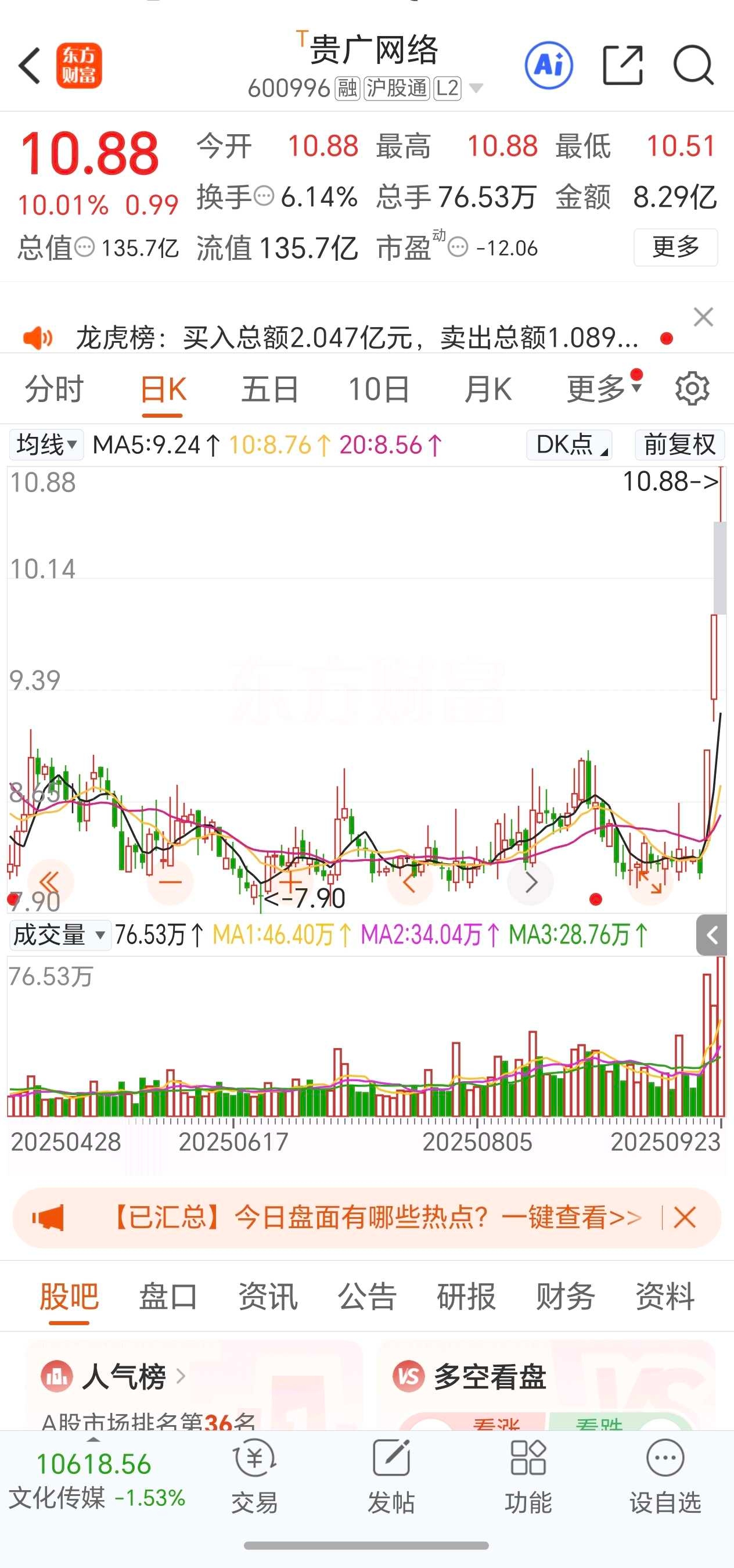 贵广网络:3板,T字弱板,炒作合作摩尔线程+东数西算。
