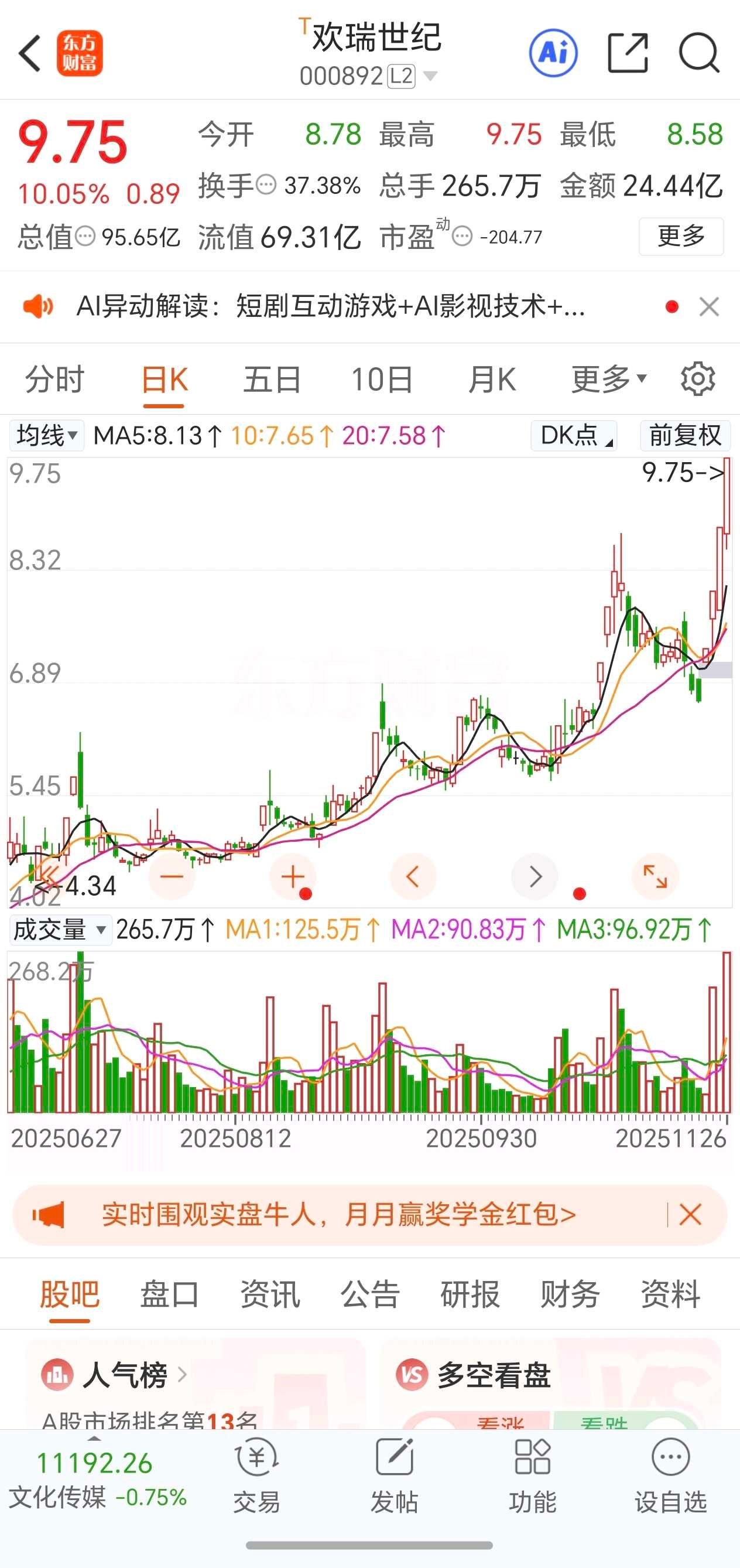 欢瑞世纪:4板,弱板,炒作AIGC+互动影游+短剧。