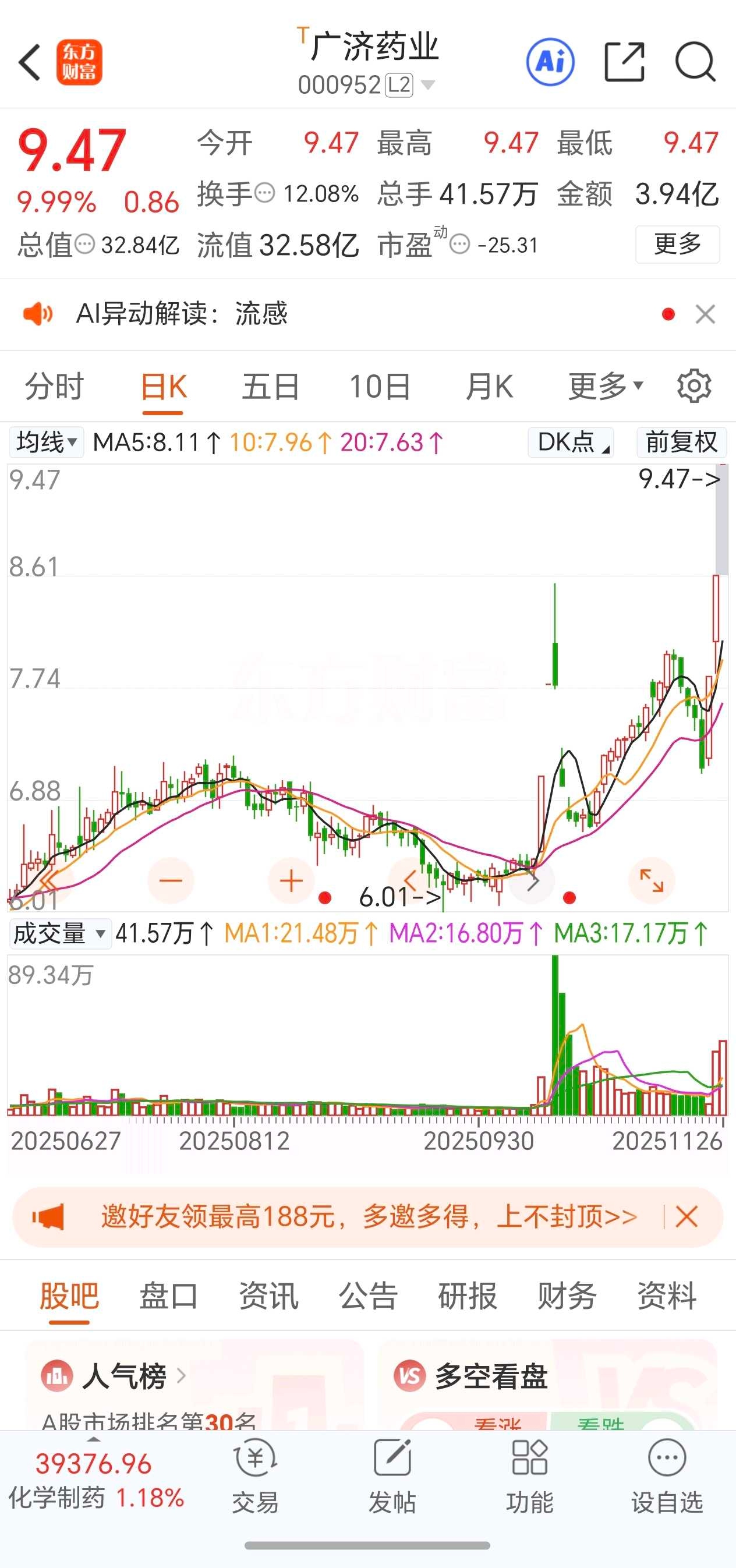 广济药业:3板,一字板,炒作流感药+医药制造+湖北国资。