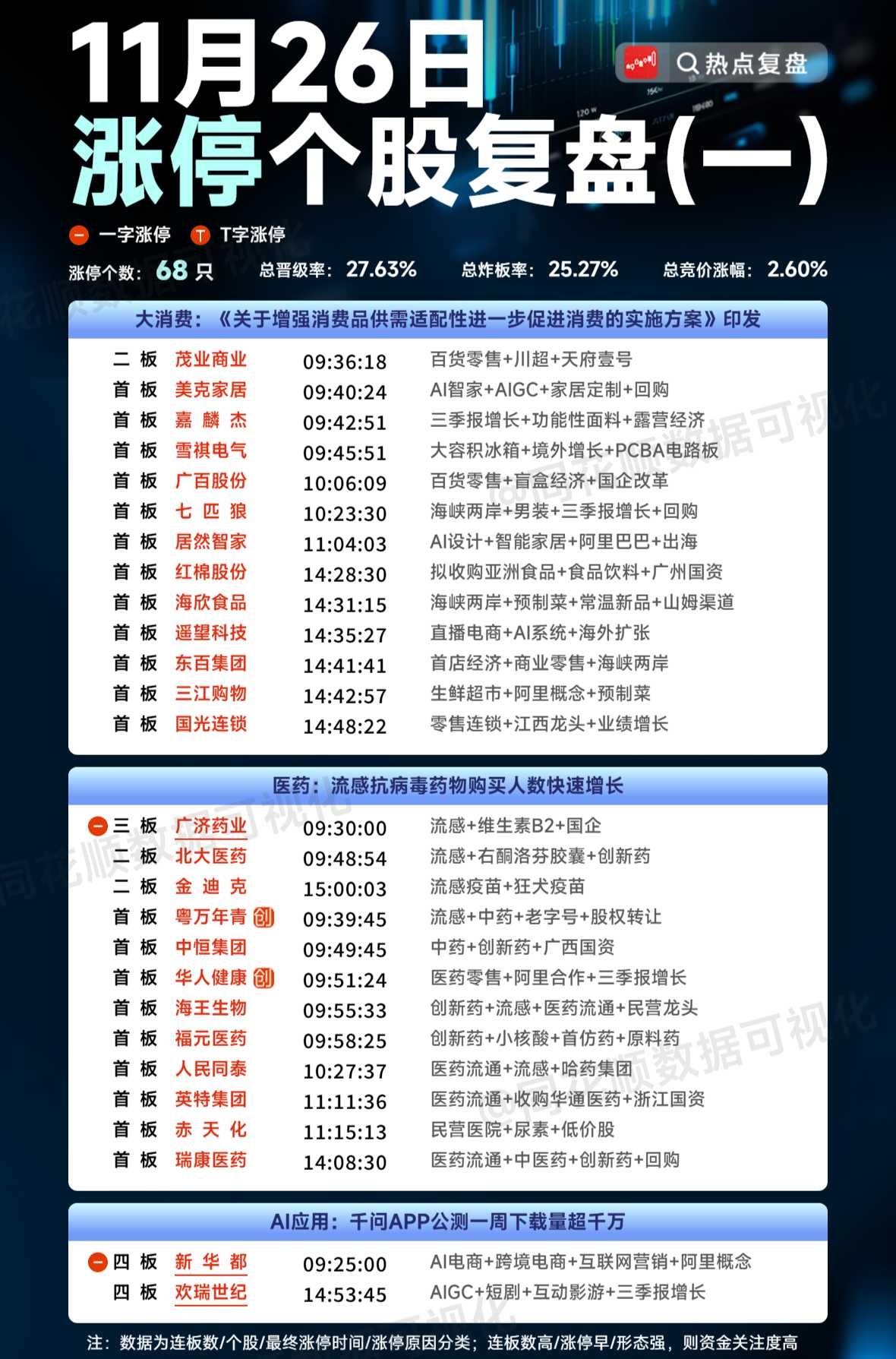 涨停方面,大消费最强,流感药再度爆发。