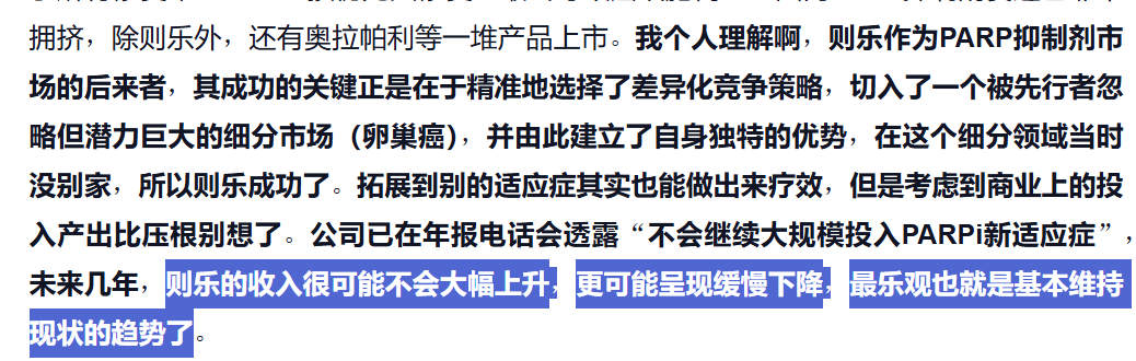 则乐的销售情况也印证了我之前的预测;中国市场中奥拉帕利(阿斯利康)独领风骚,最早进医保、适应症最全。氟唑帕利(恒瑞医药)和帕米帕利(百济神州)这两个大玩家在国内的销售也不可忽视,尼拉帕利(再鼎-GSK)算是智取,PARP抑制剂的机制真的挺有趣的,其实百济对于细胞凋亡也是有一定布局的,目前雪球没看到谁讲的特别多,大家都在聊亚盛的细胞凋亡,百济真是个会卖药的伟大企业;恒瑞自不必说,而AZ则是本地化最到位的MNC,不说后头那些新玩家,现在的老玩家名单一看就是竞争激烈,希望未来再鼎维持住这部分销量。