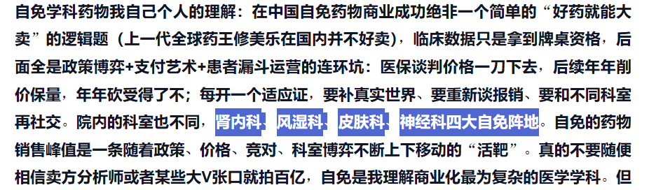 艾加莫德包括整个自免学科,大部分的信息源看到的对艾加莫德都是偏乐观的,我也维持之前的判断,后续观察再鼎如何销售放量。这个药我没去追踪第一手的信息源,之前雪球上有球友跟我聊过某个省份的销售数据好像,欢迎持续跟我交流,私信或者公开聊皆可