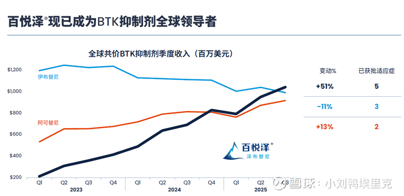 泽布替尼的市场表现远超预期,2025年前三季度全球销售额达37亿美元,同比增长140%;美国市场销售额占比达70%,处方量超过伊布替尼,成为“美国市场第一的BTK抑制剂”。其核心原因在于“疗效与安全性的优势”,以及“全球化的商业化布局”(百济神州在美国拥有近300人的商业化团队,覆盖美国血液科的重点医生及临床中心)。