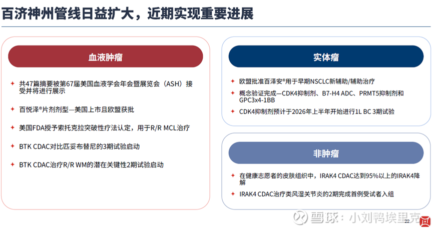 实体瘤领域:BGB-43395(CDK4抑制剂)预计2026年上半年启动乳腺癌一线治疗三期试验;BG-58067(PRMT5抑制剂)已完成概念验证,塔拉妥单抗(HER2ADC)用于小细胞肺癌一线治疗的三期试验已启动。