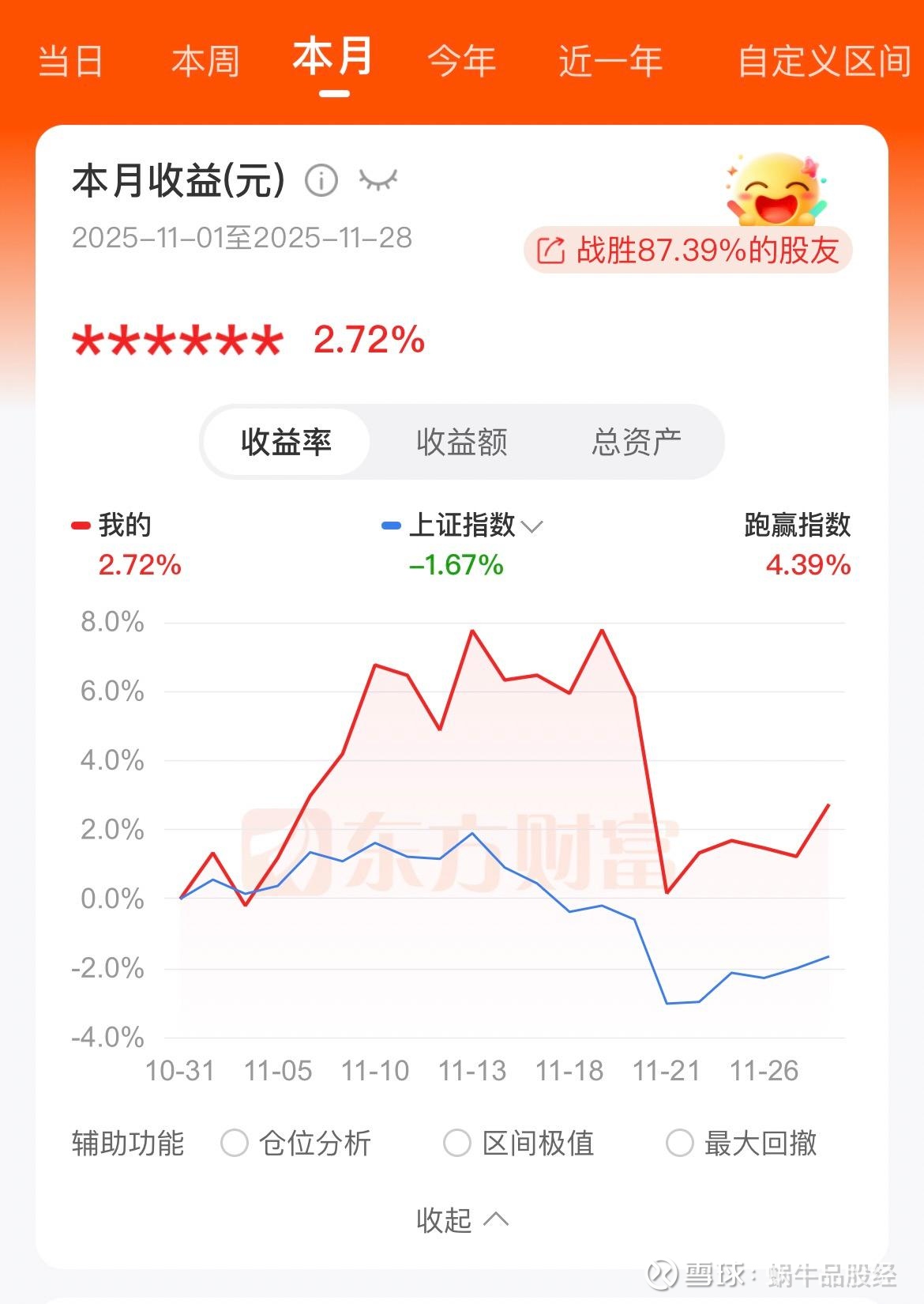 今天是11月的最后一个交易日,市场走的还算不错,通过今天的加持,小蜗牛11月勉强维持了正收益: