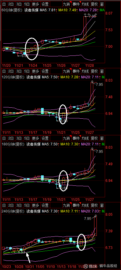 上图是603999(读者传媒)在“御风趋势”交易系统下的呈现情况。前期价格持续小幅回落,至白色椭圆处,60分钟时间周期以三根阳线接力突破并站稳四根均线,另外三个时间周期一根大阳线突破并站稳四根均线,随后价格持续维持在均线密集区上方收小K线。需要注意的是240分钟(日线)级别中紫绿两根均线在前期完成空转多(白色箭头所指处)之后保持多头排列且以一个很好的角度上行。另外三个时间周期的均线借助收小K线的时间段进行调整,逐步理顺完成空转多的动作。今日价格踩着均线快速拉伸。