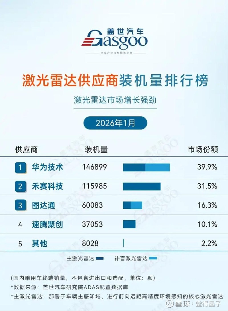 恭喜$图达通(02665)$ 进前三,速腾去年市场份额17%,现在10%都守不住。图达通,2026年1月装机量60,083颗,市场份额16.3%。速腾聚创,2026年1月装机量37,053颗,市场份额10.1%。以为你遥遥领先,那么多人吹捧,没找到跌出前三,被图达通遥遥领先了。$速腾聚创(02498)$