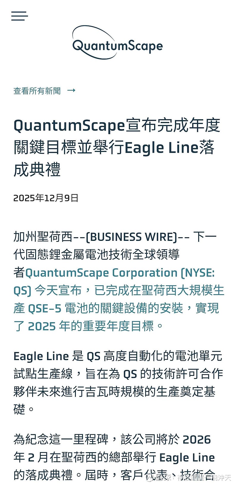 Corporation (NYSE: QS) 今天宣布,已完成在聖荷西大規模生產 QSE-5 電池的關鍵設備的安裝,實現了 2025 年的重要年度目標。}