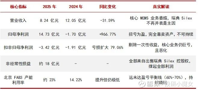 结论:14 亿利润不是靠卖芯片赚的,而是靠“卖公司”换的。扣除非经常性损益后,公司主业巨亏 3.42 亿,北京FAB3工厂产能利用率低,产能爬坡不及预期。这说明:老牌奶牛卖了,新的印钞机(北京线)还没修好。除了主营业务亏损,公司还面临资产减值和费用增长的双重压力。