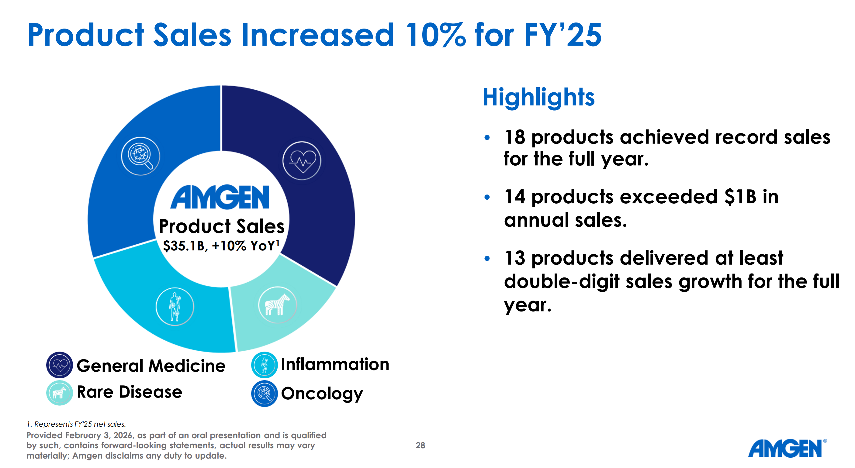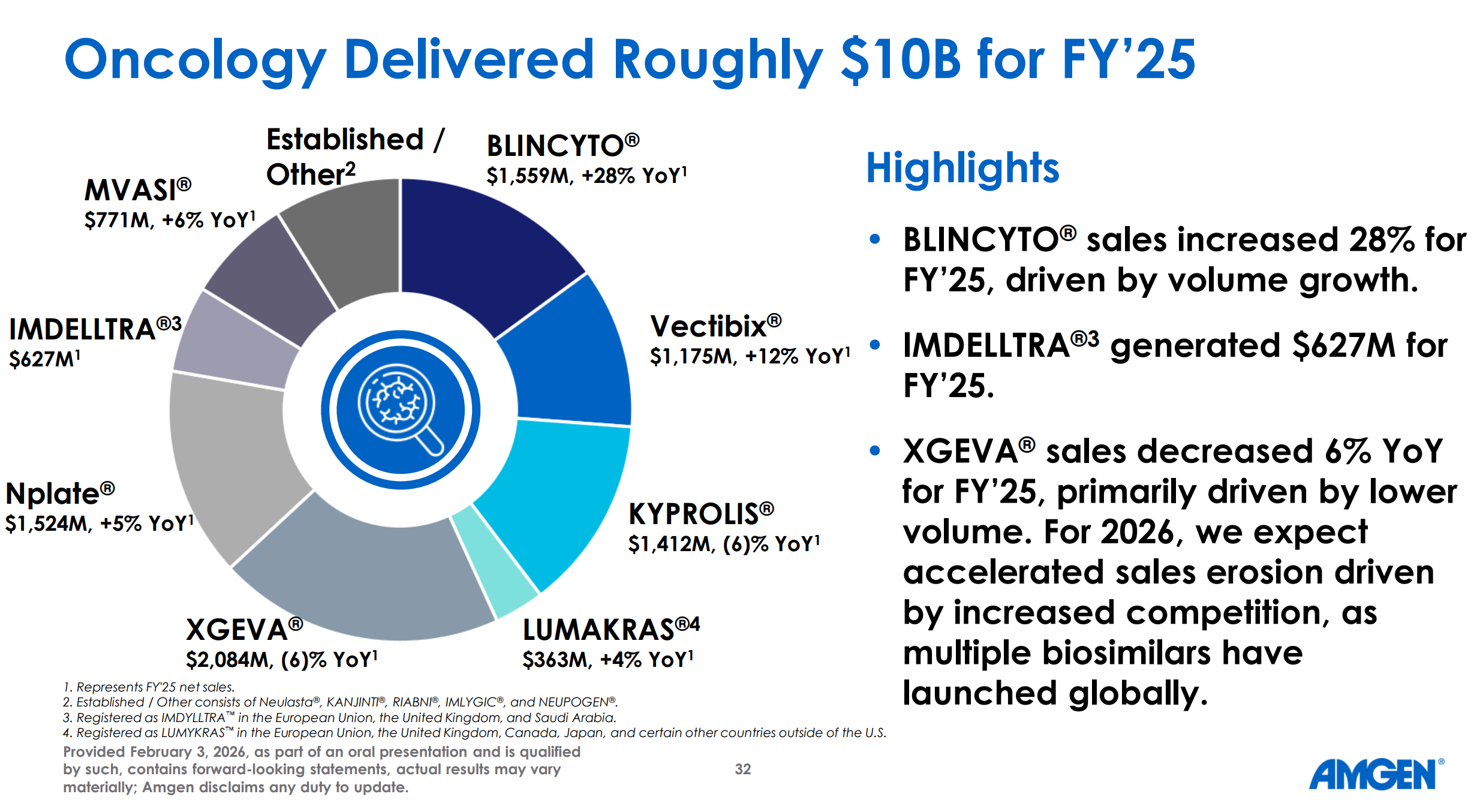 安进2024年营收超过300亿美金,在全球药企里排名第十三位。业务包含四大板块,其中肿瘤是其第二大业务板块,肿瘤板块25年营收超过100亿美金。