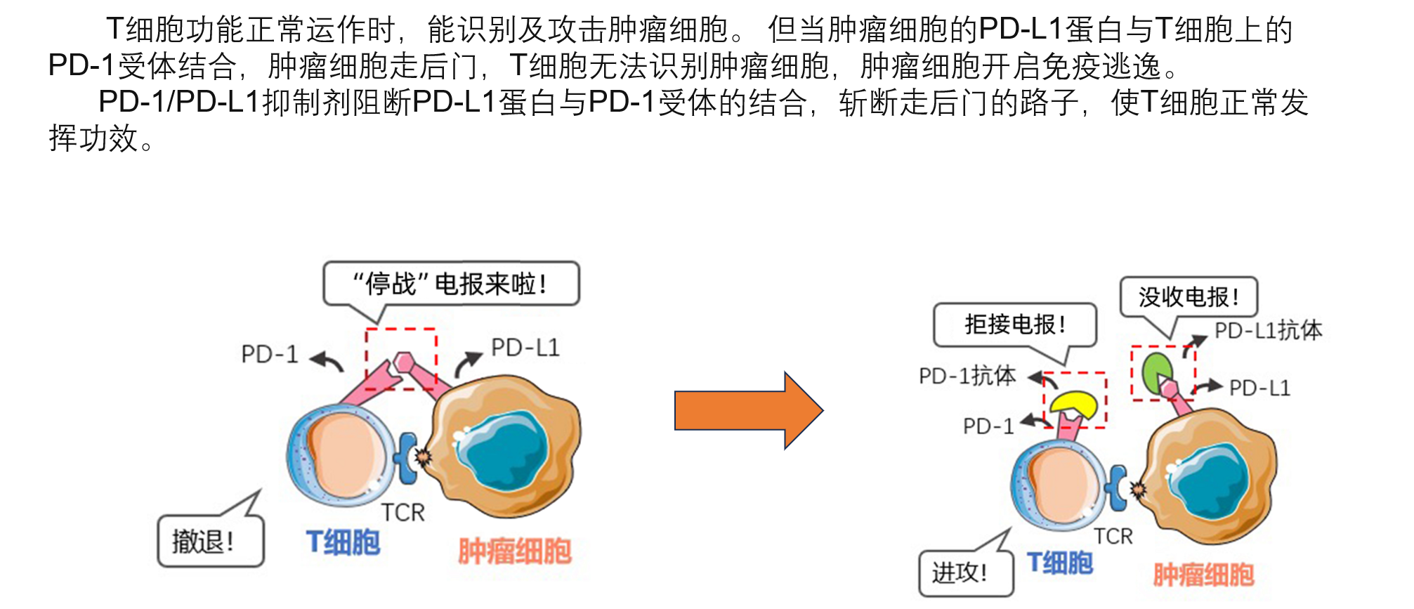 下面两张图简单讲了PD1/PDL1抑制剂药物机制的原理,核心点是通过复杂的抗原提呈过程,提呈什么呢?肿瘤细胞的样貌特征,树突状细胞拿到肿瘤细胞(罪犯)的样貌特征,相当于画了一张带有肿瘤细胞样貌特征的通缉令给T细胞(警察),T细胞带着这张通缉令去找肿瘤细胞,发现一个都会比较一下,如果对上了,就要开杀戒。但是肿瘤细胞很狡猾,有个走后门的通路,而PD1/L1抑制剂把这条走后门的路数堵上,让T细胞可以正常对肿瘤进行杀伤。