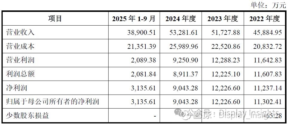 从2022到2025年,公司分别实现营业收入45,884.95万元、51,727.88万元、53,281.61万元和38,900.51万元,2025年1-9月,公司营业收入同比减少6.12%,主要是由于国内显示面板制造行业开始进入技术迭代升级的动态调整期,经过多年大规模投资建设后,6代线新建速度逐步放缓,使得公司6代线蒸发源业务收入逐年减少,同时,公司8.6代线蒸发源在手订单在2025年1-9月尚未实现收入,暂未形成对6代线新建业务的替代。