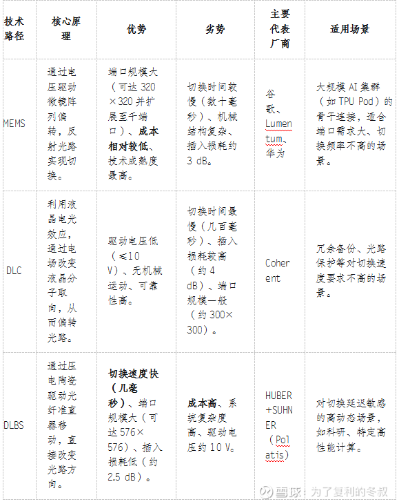 OCS主流技术路径包括MEMS(微机电系统)、DLC(数字液晶)和DLBS(压电陶瓷光束偏转),关于三者的核心差异,做了张表,但雪球好像不支持表格上传,就截个图凑合看看: