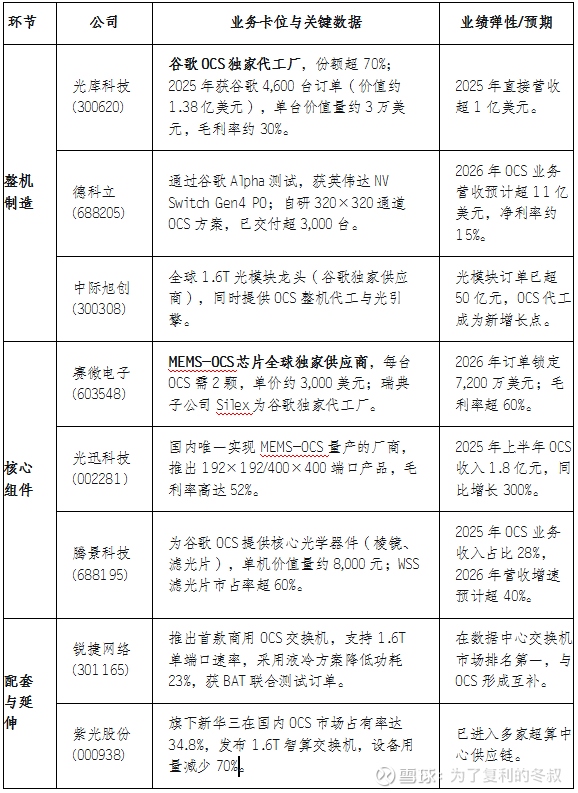 小结:$光库科技(SZ300620)$ 在整机制造环节份额最高,短期营收弹性最大;$赛微电子(SZ300456)$ 掌握核心MEMS芯片,技术壁垒与长期价值突出;$德科立(SH688205)$ 则有望在谷歌供应链中获得更大份额,长期订单弹性显著。