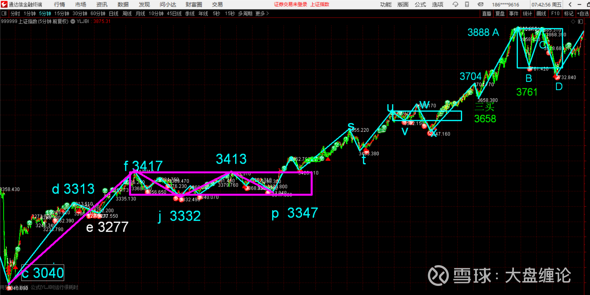 3、由于pu和xA都是五分级别的类走势结构,根据走势的自相似性:“最后的出中枢段大概率也会延伸出五分级别的类走势结构”。结论:过了3888以后,理论上,上方仍有时间和空间让你减仓。别着急忙慌的吓自己。