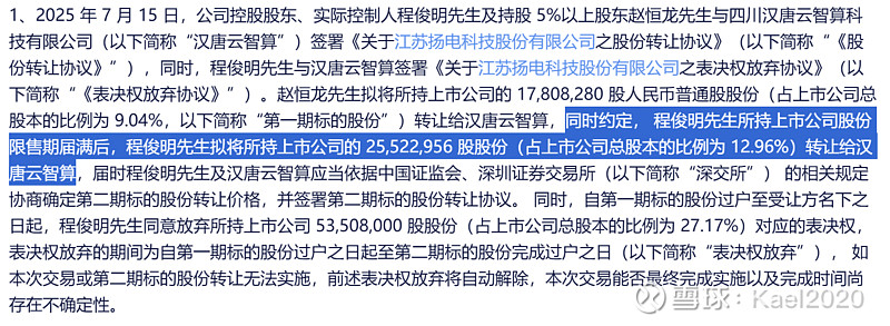 之前公告中双方约定,程俊明先生所持上市公司股份限售期届满后,程俊明先生拟将所持上市公司的25,522,956股股份(占上市公司总股本的比例为12.96%)转让给汉唐云智算(以下简称第二期标的股份)。
