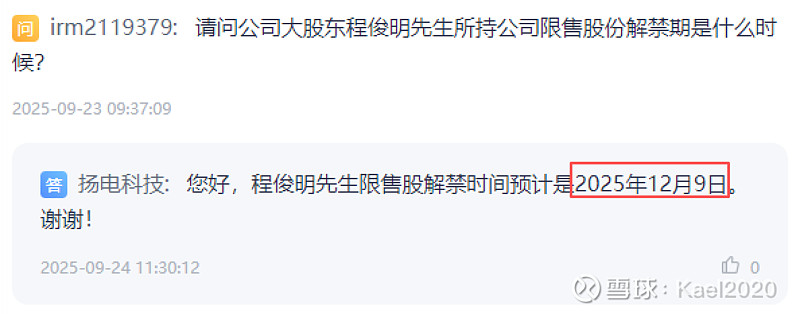 大股东的股份将于12月9号,也就是明天解禁。